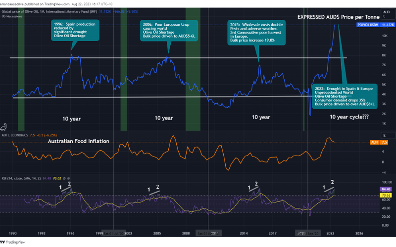 The olive oil sector has long followed cyclical pricing patterns, typically alternating between low and high price phases roughly every decade. The current surge aligns almost perfectly with the predicted start of another 10-year cycle, occurring just three years into its anticipated timeline. Furthermore, a notable correlation has been identified between the Australian Food Inflation Index and the Global Olive Oil Price Index as reported by the International Monetary Fund (IMF). This connection illustrates the deep interdependence between food commodity pricing and global economic conditions.