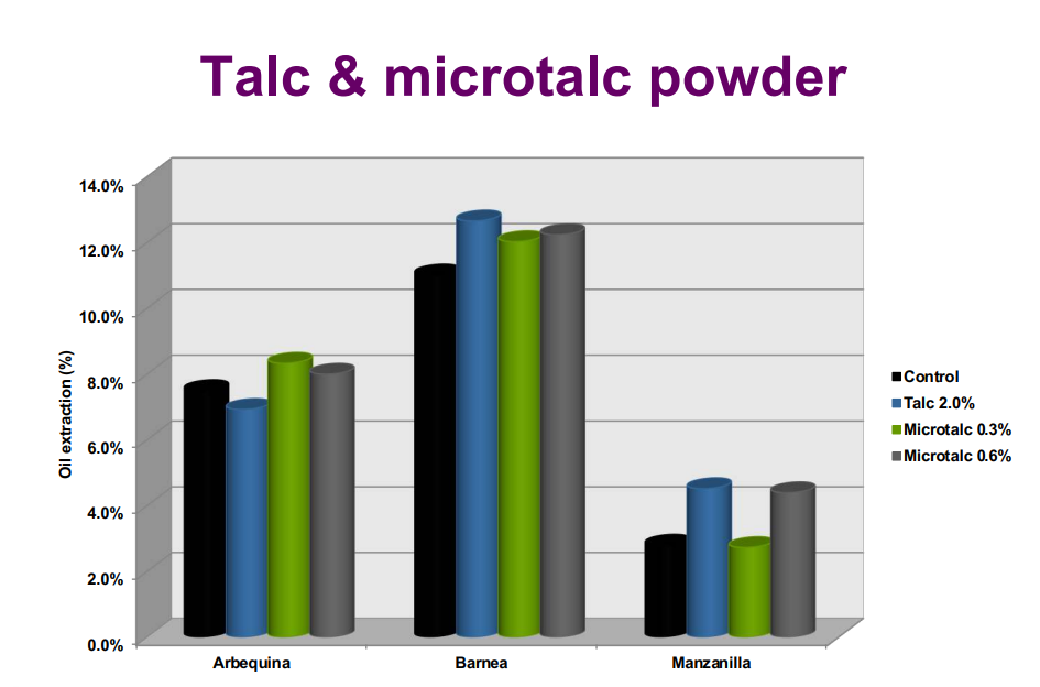 Graphs demonstrate substantial extractability improvements across varieties such as Arbequina, Barnea, and Manzanillo when talc or microtalc is added.