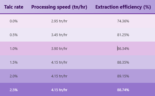 A detailed trial in Manzanillo fruit (61% moisture) shows extraction efficiency rising from 74.36% (no talc) to 89.15% at 2.0% talc.