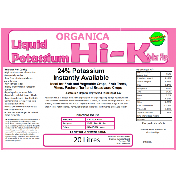 | Label-HiK-Label-06-22.pdf | Organica Bio-Hi-K – Liquid Potassium 24% Foliar Plus | Safety Data Sheet | Specifications | Document |
