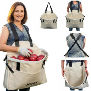 Picking bags and baskets are also important: workers can wear a picking bag to drop olives into as they hand-pick or move along the rows, then empty the bags into crates or bins periodically. Good picking bags distribute weight, are not too large and often have a quick-release bottom to safely transfer olives without spillage and impact which minimises bruising.