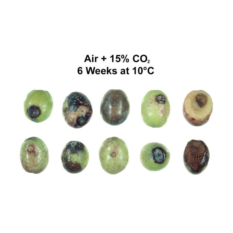 By contrast, controlled atmospheres containing approximately 2% oxygen combined with up to 5% carbon dioxide have been shown to maintain flesh firmness and preserve green skin colour when olives are stored at 5°C (41°F) or higher.